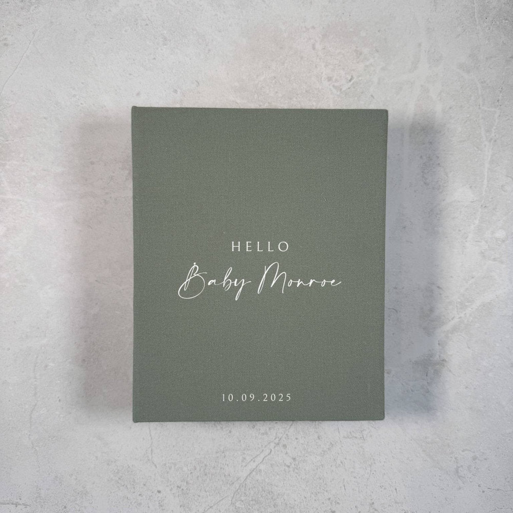 This custom baby photo album is a slip in album that features Design 54, handmade to hold and protect your little one’s special memories. Each page includes clear pockets that make it simple to add and arrange your favourite photos. The linen cover feels soft but sturdy, creating a gentle and timeless look that suits any nursery or baby shower theme.