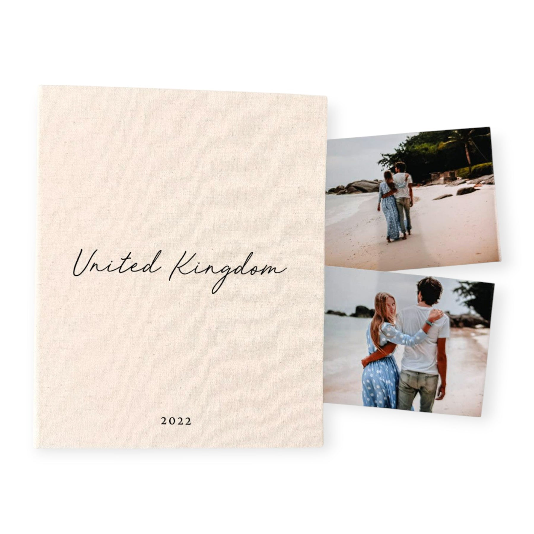 This custom travel photo album is a slip in album that features Design 82, created to protect and display your favourite travel moments. Each page includes clear photo pockets that keep your prints neat and easy to arrange. The linen cover feels smooth and durable, giving the album a timeless finish that complements your adventures perfectly.