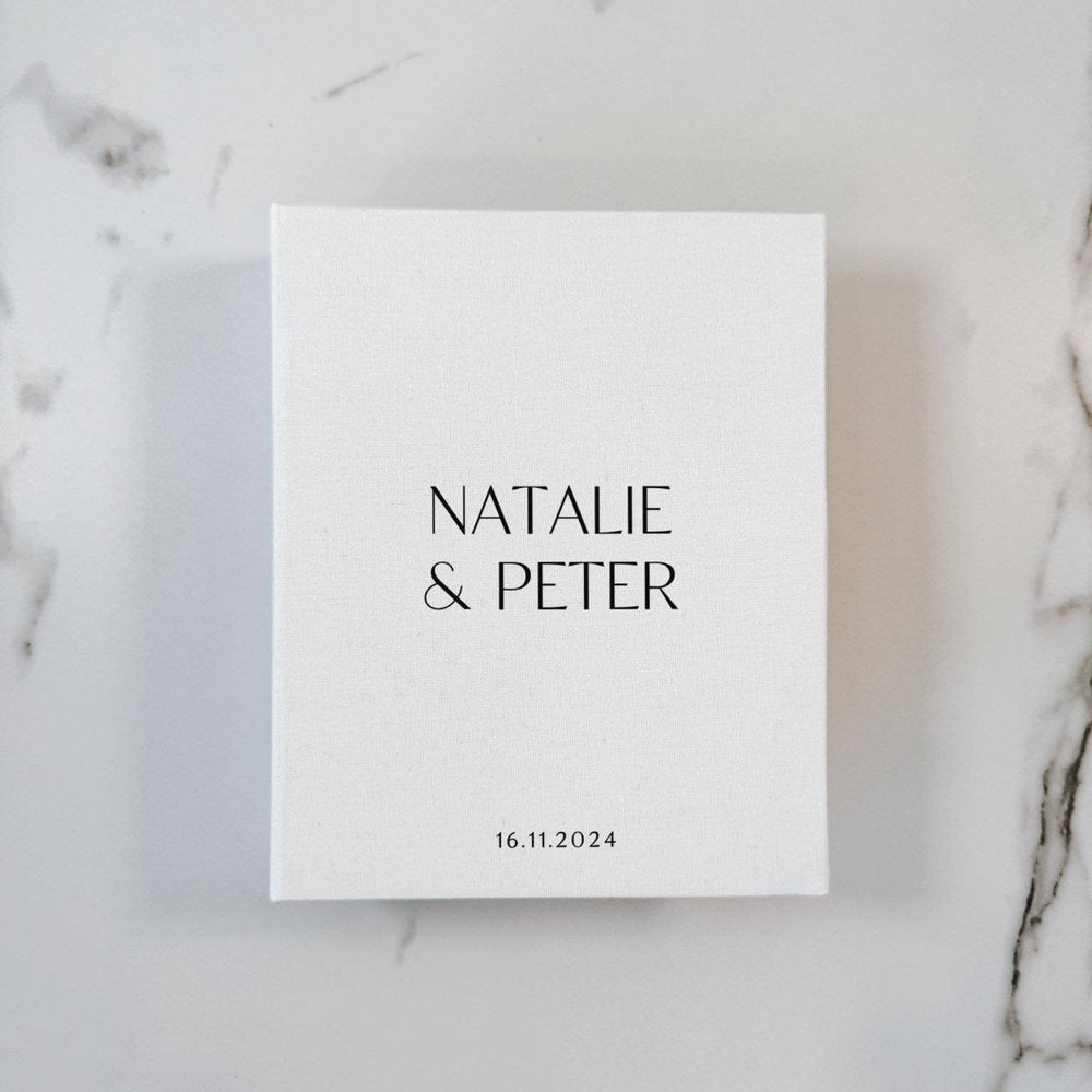 This custom wedding photo album is a slip in album that features Design 11, created to protect and display your most cherished wedding photos. Each page holds your images securely in clear pockets that make it easy to insert and organise your prints. The linen cover feels soft yet strong, offering a refined finish that suits any wedding style or decor.