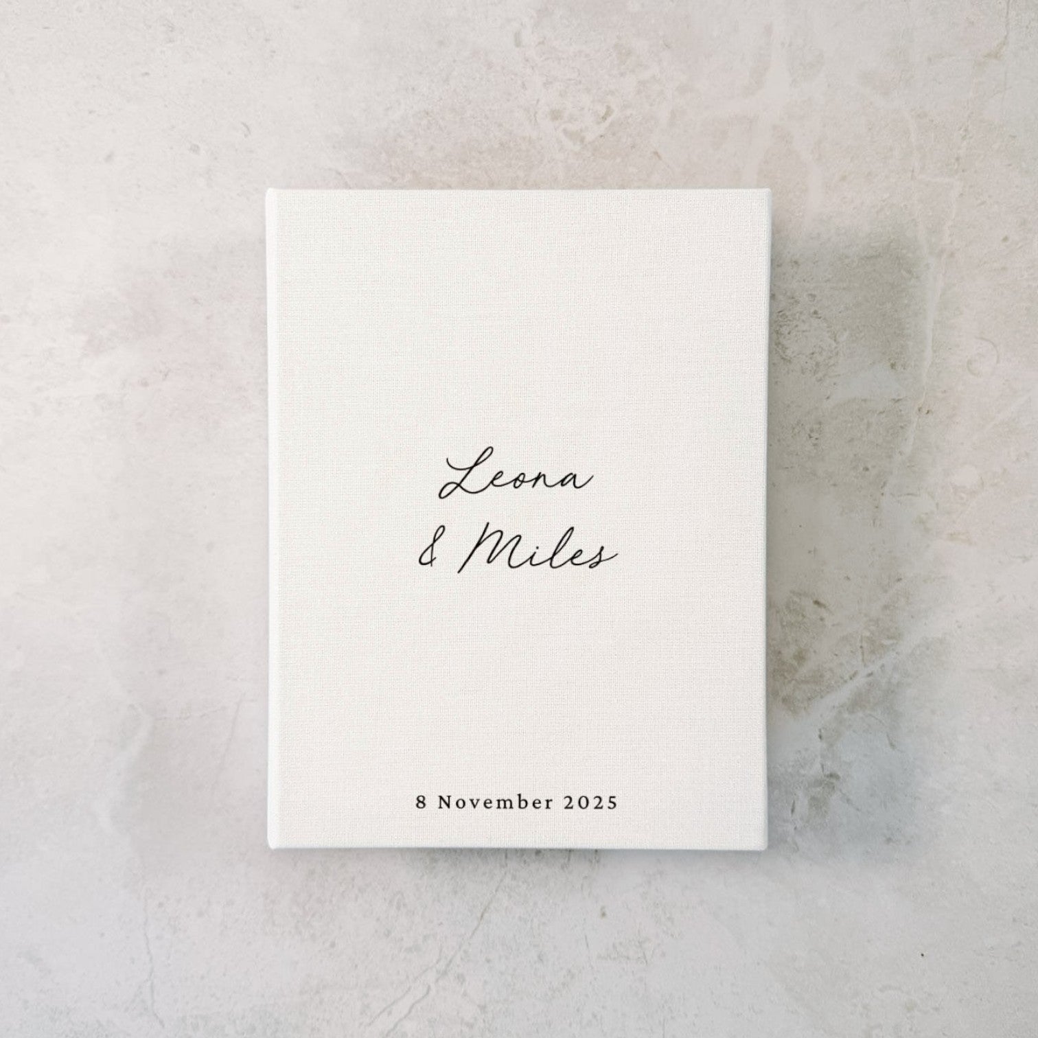 This custom wedding photo album is an instax mini album that features Design 19, created to protect and showcase your favourite wedding memories. Each page holds 4 instax mini photos securely in clear pockets, keeping your images bright and safe. The linen cover feels soft yet sturdy, offering a refined finish that complements any wedding style or decor.