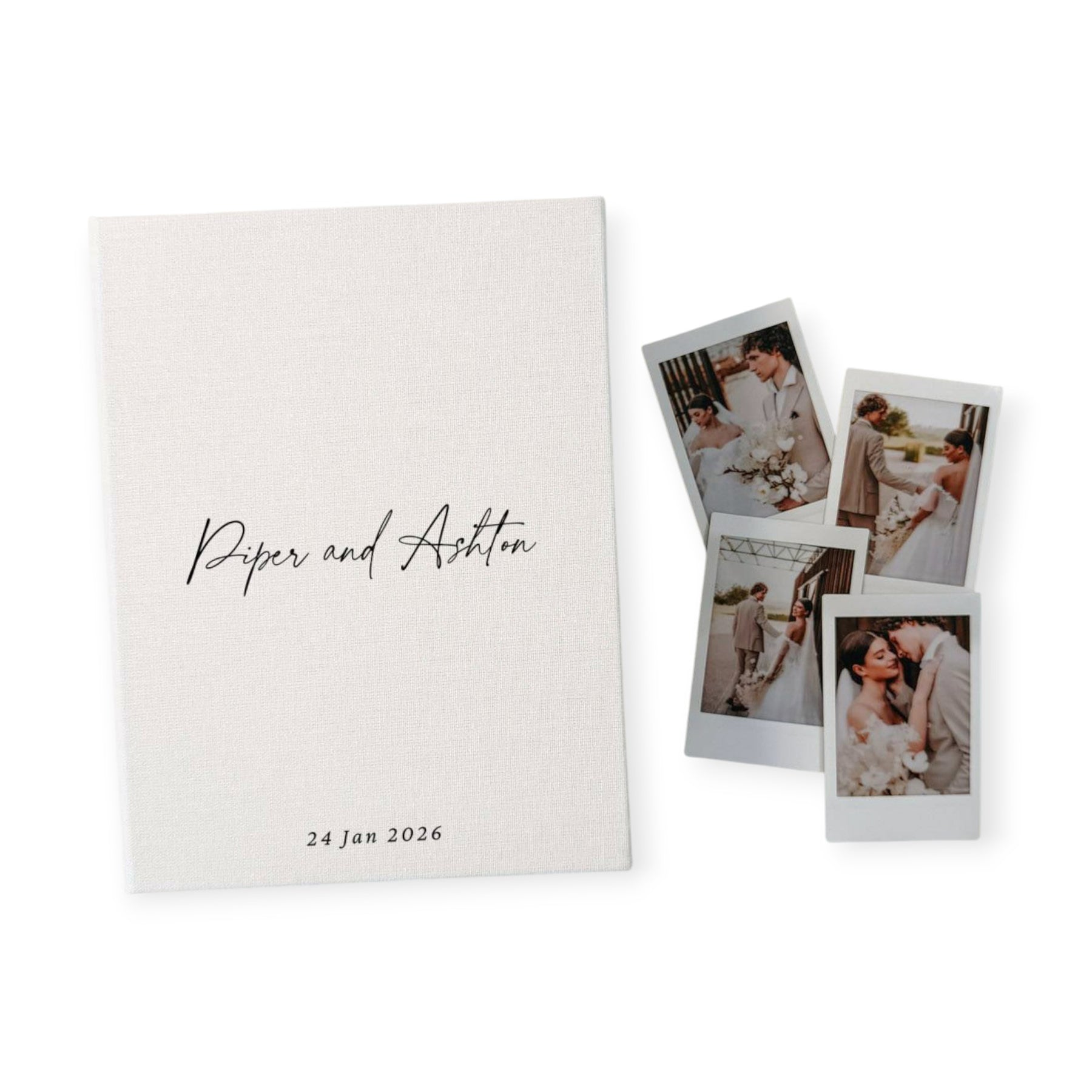 This custom wedding photo album is an instax mini album that features Design 21, created to protect and showcase your favourite wedding memories. Each page holds 4 instax mini photos securely in clear pockets, keeping your images bright and safe. The linen cover feels soft yet sturdy, offering a refined finish that complements any wedding style or decor.